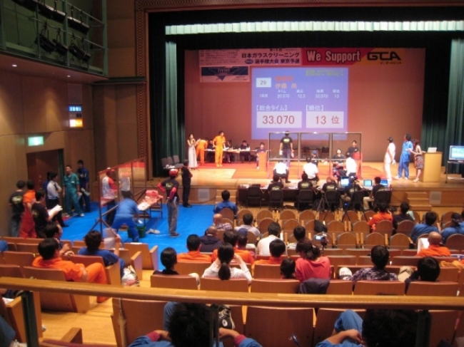 ニュース 第15回 ガラスクリーニング選手権大会 東京予選 2012年6月6日に「第15回 日本ガラスクリーニング選手権大会 東京予選」が代々木の国立オリンピック記念青少年総合センターにて開催されました。 写真は会場全景です、ステージ上では緊張感たっぷりで熱い戦いが繰り広げられます。ステージ上で本番が緊張感たっぷりに進む中、ステージの袖では次にステージに上がる選手たちが練習しています。 本番は1発勝負なので練習エリアは選手たちの熱気でステージ上よりヒートアップしています。今大会では当社スタッフの横山が優勝の栄冠を見事成し遂げました、おめでとうございます。 またもう1名もベスト15位に入賞し当社から2名が全国大会出場の権利を獲得しました。 全国大会も良い報告が聞けるよう期待しております、がんばってください。 2012年6月6日に「第15回 日本ガラスクリーニング選手権大会 東京予選」が代々木の国立オリンピック記念青少年総合センターにて開催されました。 写真は会場全景です、ステージ上では緊張感たっぷりで熱い戦いが繰り広げられます。 工事のポイント 前へ 一覧へ戻る 次へ