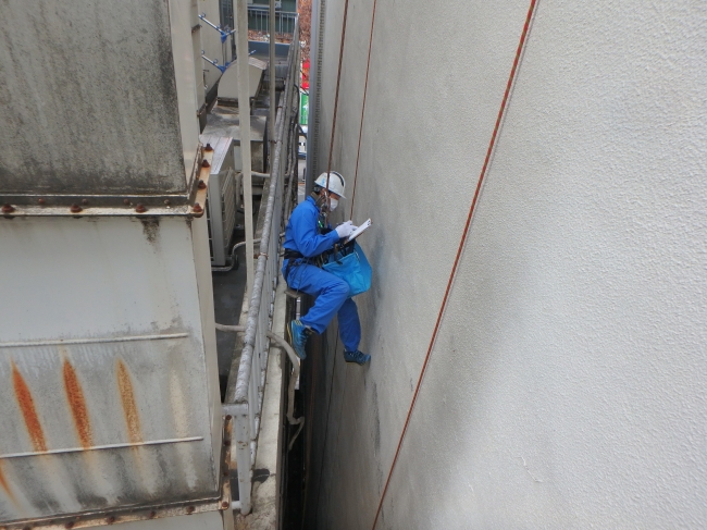 点検・調査 外壁調査 、隣接するビルが近いため、足場、ゴンドラの設置が不可能です。 また、調査対象のビル屋上看板にはネオン管があるため屋上からの下降も不可能となります。 そのため、今回は ①ロープを屋上から垂らし ②地上からユマール(登り返し)を行いました。モルタルの浮き ひび割れが多く確認されました。 、隣接するビルが近いため、足場、ゴンドラの設置が不可能です。 また、調査対象のビル屋上看板にはネオン管があるため屋上からの下降も不可能となります。 そのため、今回は ①ロープを屋上から垂らし ②地上からユマール(登り返し)を行いました。 工事のポイント 足場の設置が不可能な箇所をロープ作業で外壁の調査を行いました。 前へ 一覧へ戻る