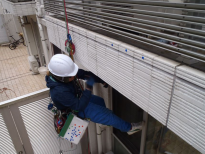 ロープ作業にて近接目視、打診調査のマンションの外壁調査を行った。
