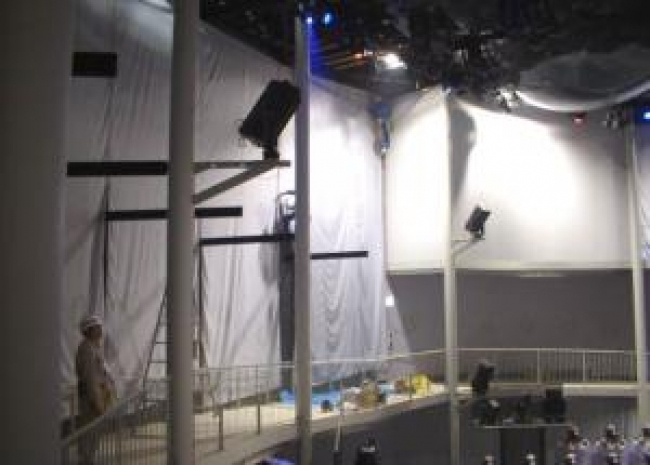 愛知万博会場に、映像スクリーンとなる防炎紗膜を設置。足場や重機を使えないため、天井キャットウォークより垂らしたロープをアッセンディング(登返し)しての作業となりました。